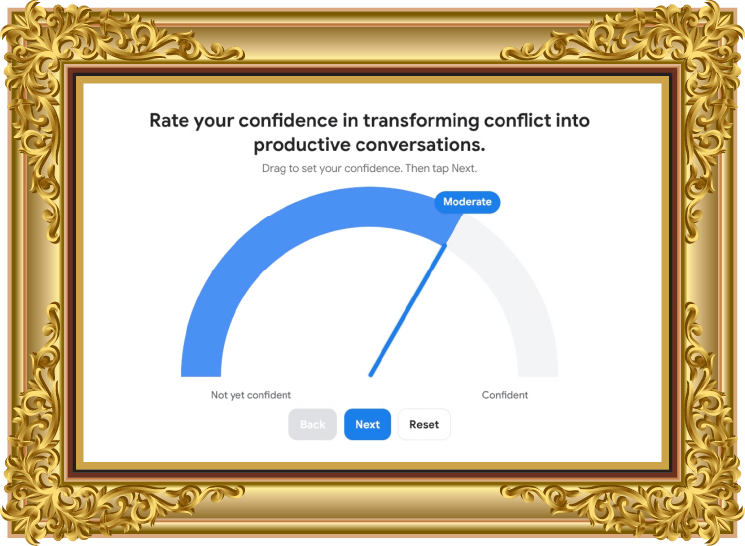Our Thought Partner wanted a way for learners to self-assess their confidence in different areas so they could identify how the learning material would benefit them. Inspired by Chase's Storyline work with Intuit content, I used ChatGPT and Gemini to craft an interactive confidence dial through a custom code block that would work on Google sites. We came up with a solution that the thought partner loves!