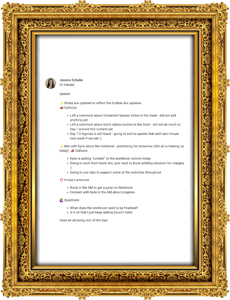 We celebrate Jess's updates, which are truly a work of art in professional communication. These reports are consistently sent proactively, thoroughly organized, and expertly leverage tools like emojis to guide the reader.